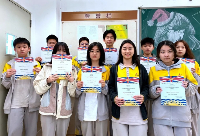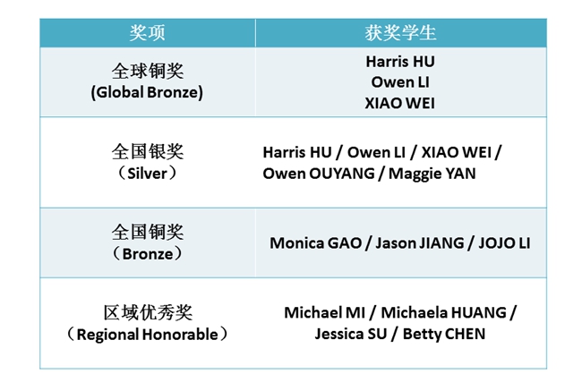 加拿大最具学术性、最具权威性的化学思维挑战——加拿大化学思维挑战(CCC)获奖率65%:国际部高一学生 Lynn LI / Patrick PAN、高二学生 Harris HU荣获银奖;高二学生WEI XIAO 荣获铜奖;高一学生Joshua ZHANG / Jerry YU、高二学生Owen LI / Chris QIAN / Owen OUYANG荣获区域优秀奖;