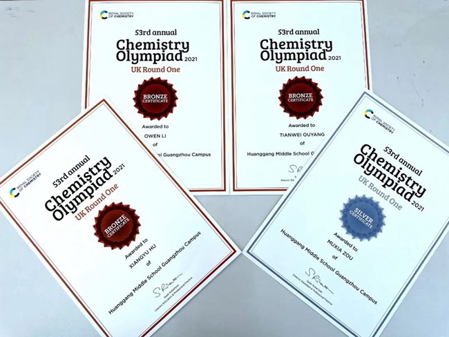 英国历史最久、学术性最强、影响力最大的高中化学奥赛——英国化学奥赛(UKChO)获奖率80%:国际部高二学生 Catherine ZHOU 获全球银奖,Harris HU / Owen OUYANG / Owen LI 获全球铜奖;