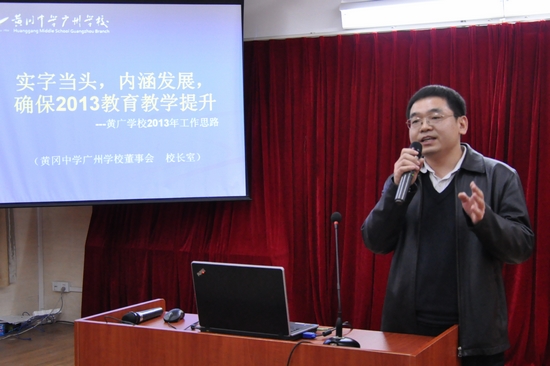游书记强调2013年学校更大的价值就是路在脚下,他提出五句话“将务实与执行发扬光大;德育毫不放松;教学加大力度;服务要上台阶;团队要有突破”,为学校前进的五大块指明了方向。他寄语全校教职工,一份耕耘、一份收获,明确自身价值观。2013年,广州市黄广中学之年。