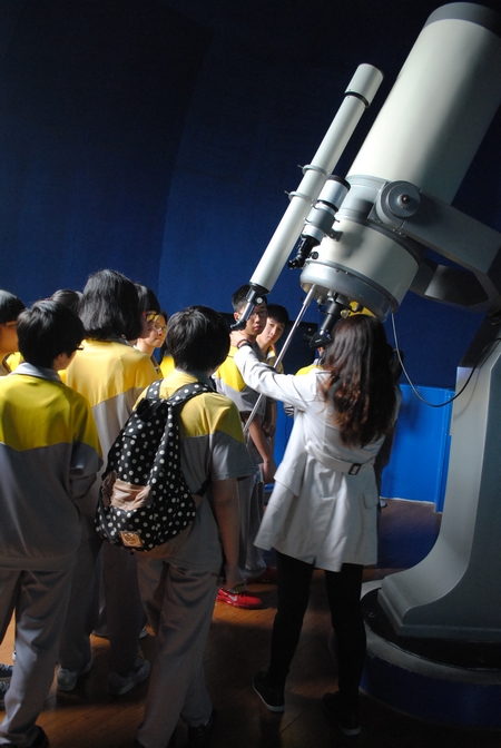 最后,解说员将我们带到顶楼领略期待已久的镇站之宝——天文望远镜。解说员详细地介绍了天文望远镜的相关知识,使同学们收获颇多。