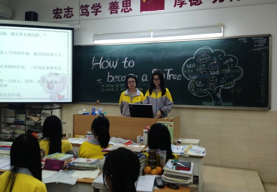4月26日晚第二节课,高二(4)班召开了一场名为“如何从一棵小树长成为大树”的主题班会。黑板上班级的同学都变成了大树的果实、枝叶与主干。同学们从“小树”成长为“大树”所需要的条件:根基、不动、向上长、阳光、时间等五个方面进行了深入的讨论。