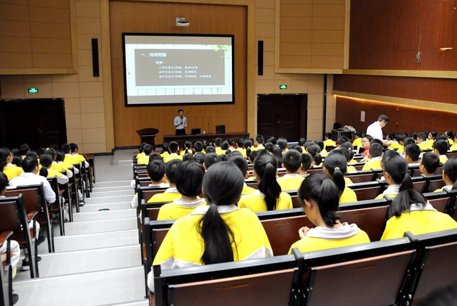 讲座中,侯立兵教授结合自身从事诗词研究及高校教学的多年经验,就学生诗词学习中可能遇到的问题作出综合性的列举分析,指出现代学生在诗词背诵积累以及理解鉴赏容易陷入的误区,并围绕“诗词如何活记”的重要核心,现场传授黄广学子“侯氏秘籍”——包含时空定位法、质疑追问法、诗话代入法、格律助记法、得句进篇法的“诗词活记五法”,结合学生诗词学习中实际遇到的疑难作进一步的展示,鼓励学生在学习过程中全面掌握且灵活运用“活记五法”,引导学生从古典诗词的创作铁律至典故发掘等方方面面体会不一般的成就感与大乐趣。