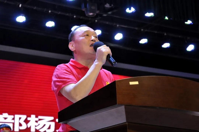 范小星校长代表董事会,向初三年级授予军团战旗。这已是黄广学校中考誓师的一项传统,今年由刘清华、殷玉莲两位主任共同承接使命。