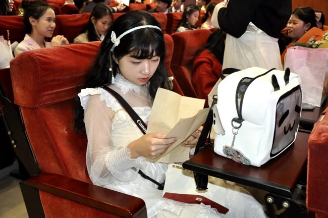 在本年度成人礼,学校新设“父母家书”环节,鼓励学生父母借本次机会将日常中无法直面表达的温暖关怀与无私关爱都倾注于笔尖,化作信纸上朴实动人的千言万语。