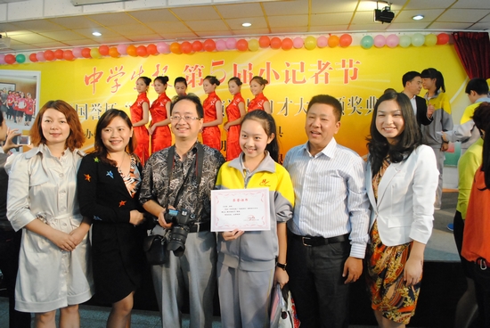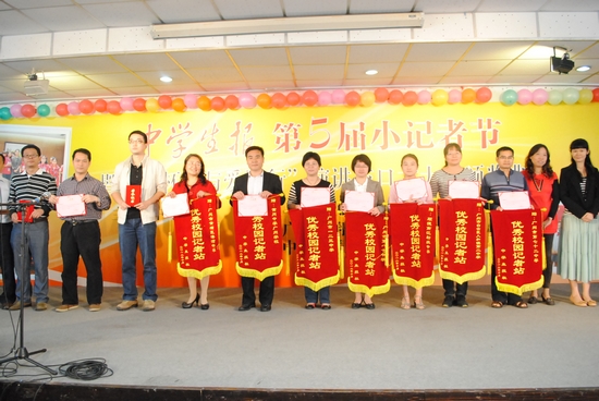 11月4日9时许, 《中学生报》第五届小记者节暨“与爱同行”演讲大赛颁奖仪式在广东省第二师范学院举行。《中学生报》社长王裕强致开幕词,广东省教育厅和省关工委领导先后致辞!《中学生报》主编,“红姐姐工作室”主任“红姐姐”宣布本次“与爱同行”演讲与口才大赛的比赛结果! 在50所参赛学校中,广州市黄广中学才与演讲大赛”颁奖仪式上的最大亮点。李欣微独得3000元特等奖金和800元活动奖券,并荣获“十佳小记者”荣誉称号;赖道越获得500元奖金,宁静获得200元奖金,高嘉伟获得预决赛三等奖;广州市黄广中学优秀校园记者站”;杨震老师荣获《中学生报》记者站“优秀指导老师”荣誉称号和演讲与口才大赛“优秀指导老师”荣誉称号! 颁奖过后,特等奖获得者李欣微和3名一等奖选手分别作5分钟现场演讲,把颁奖仪式推向高潮!会后全体成员到图书馆门前合影,记者对李欣微家长进行现场采访!下午,大家还参加了省新闻出版局尹敏为小记者们培训以及小记者动漫摄影等小记者节的相关活动。