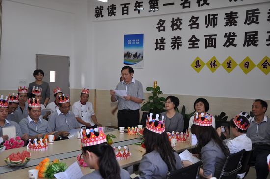 大家在欢乐的歌声中齐聚一堂,由主持人陈静委员宣布本次生日会开始。首先由范校长宣读集体生日寿星名单,同时请工会委员和生活部的老师们依次送上生日帽和鲜花,并祝各位寿星生日快乐,身体健康,工作顺利!梁董事长为寿星们送上了热情诚挚的祝福,让生日会感受到了一种家的温馨!工会主席江楚桥副校长也向在座的各位寿星献上了美好的感言和亲切的慰问!