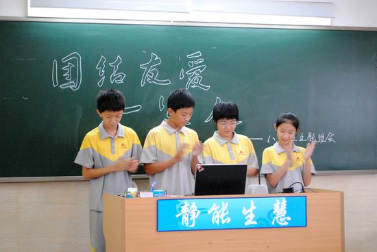 9月26日下午第一节课,我们八(8)班上了一节以“团结友爱一家人”为主题的班会公开课。整节课由我班的主持人王苏粤、刘派、谭心弦、李昊年主持。校领导、班主任以及任课老师等三十多人来参加了我们的班会。 上课铃一打响,班主任朱老师首先上台,在轻松的音乐声中,将一双筷子轻而易举地折断了,而后又尝试把一大把筷子折断,结果没能成功,用简明生动的例子阐述了“团结就是力量”这个道理,引出了今天班会的主题。 为了让大家更深刻地体会到团结的力量,我们开展了一个两人三足版的踩气球游戏:两个人一组,在内侧腿上绑五个气球,参赛者要在保护自己气球的情况下踩爆对方的气球,最后所剩气球最多的一组获胜。游戏进行得很激烈,同学们都在为场上的参赛者呐喊助威。在紧张的比拼过后,吴铠岚和张玮琦同学以绝对优势赢得了这场比赛。 游戏过后,大家一起欣赏了由关昊中等同学倾情演绎的情景剧《值日》。小品讲述了在一次大会上,我们班被主任点名批评卫生差。由于刚开学,同学们对待值日也很漫不经心,与劳动委员发生了争执。当天晚上,值日生们又聚在一起谈了话,意识到了班级荣誉感和团结的重要性,在不懈努力之后,获得了主任表扬的故事。 随后,一首《众人划桨开大船》的合唱将整场班会推向了高潮。我们这一家人手拉着手唱响了这支激情澎湃的团结之歌,同学们的声音充满了力量,深深地感动了在场的领导和老师,也更坚定了我们41颗团结友爱的心。 班会的最后,我班41名同学庄严宣誓,为班级荣誉而努力,为班级团结而奋斗!就这样,带着同样的信念,同样的梦想,我们齐步向充满光明的未来踏进…… 在一片热烈的掌声中,我班“团结友爱一家人”的主题班会圆满地划上了句号。八(8)班41名学子构建了比血缘关系更加亲密的大家庭。同学们手拉着手,肩并着肩,目送着老师们离去。