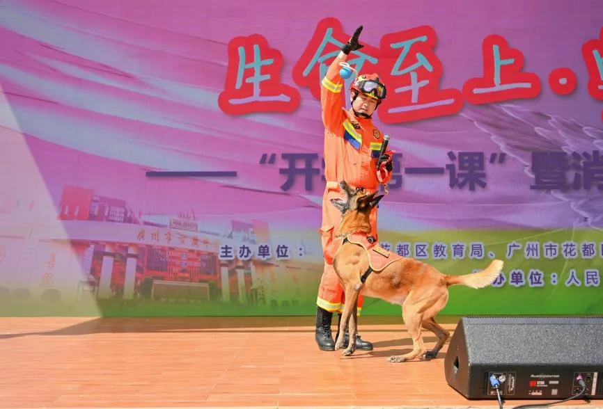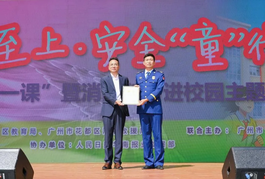 同日上午,黄广中学同步联合花都区教育局、花都区消防救援局隆重举行“生命至上 · 安全‘童’行”开学第一课——暨消防科普进校园主题活动。