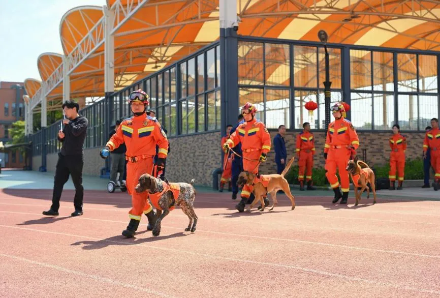 现场1000余人参与、观摩了模拟火场逃生、云梯救援演练,消防搜救犬技能、消防救援装备展示。学生近距离接触液压破拆工具组、热成像仪、消防无人机等“高精尖”装备,观摩了消防指战员原地着装、快速铺设水带、灭火器灭火实操演示,还穿战斗服体验穿越逃生帐篷......