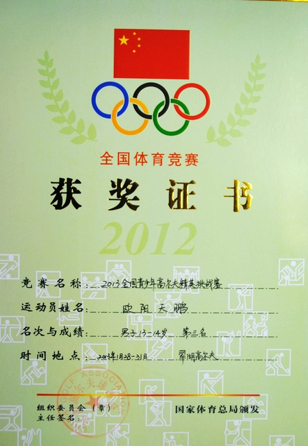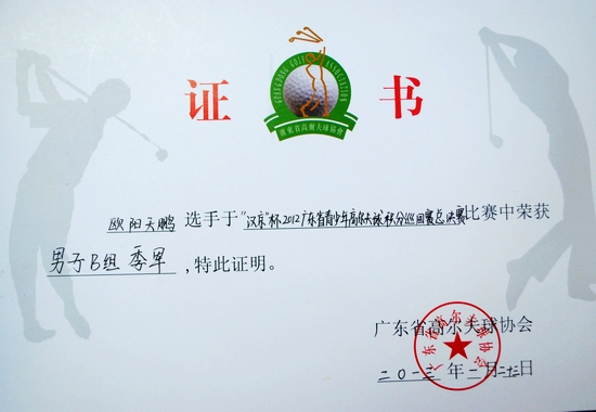 蛇年新春,开学伊始,我校校长室喜获佳讯:我校七年级(9)班的欧阳天鹏同学在今年寒假参加了一系列高尔夫比赛,成绩斐然。分别是:中国高尔夫球协会主办的"2013全国青少年高尔夫精英挑战赛男子13-14岁第三名;“汉京杯”2012广东省青少年高尔夫球积分巡回赛总决赛男子B组季军;观澜湖青少年系列赛男子12-15岁组别总杆亚军。