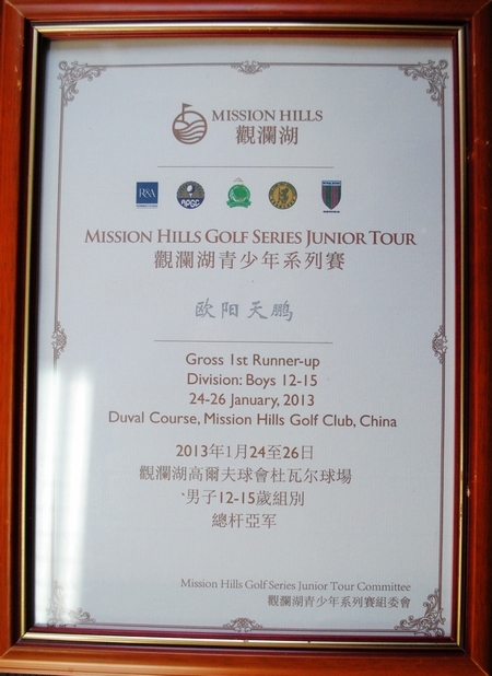天鹏同学在读小学时,就受父亲的影响,深深地迷上了高尔夫球这项精英运动,也逐渐成为他为之奋斗的理想。在此期间,他先后获得了一系列荣誉:广东省青少年高尔夫球总决赛 B组 ,季军;国际青少年锦标赛,亚军;入选中国青少年高尔夫球国家队出征法国依云大师赛,获得了第六名;第七届中信银行青少年高尔夫对抗赛C组 ,第三名;第十六届全国青少年高尔夫锦标赛 B组冠军。