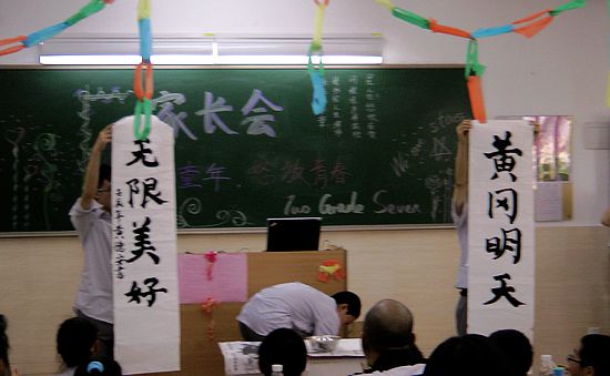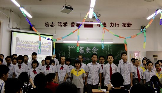 2012年6月1日,七(2)班主题为“告别童年,怒放青春”的家长会,在《童年》的歌声中拉开的帷幕。悠扬的歌声,把与会的学生、家长、老师带到了童年的时光。 15:00正,李琛、赵红霞、张叶钊、刘樱、戴明阳、覃欣怡六位中文主持人和李泽钧、龚导两位英文主持人闪亮登场,以一首主题为《回首童年,放飞梦想》的诗歌为主持词,宣布家长会的开始。蒋程煜、陈睿等同学对父母恩情的内心告白,感动了他们的父母也感动了全班家长;肖玮明爸爸的嘱咐和梁思泓妈妈的深情,让所有学子久久难忘。真情洒满整个教室,这是心与心的交汇,爱与爱的融合! 陈星宇、顾家豪、龙迪聪领诵《少年中国说》,昭示着青少年学生以身许国、努力学习、发奋图强的精神;刘祺泓、刘洁、邓孟清、陈泽锋、伍晓晴、戴明阳、蓝可逸、江彦谊8位同学的葫芦丝齐奏《希望》,范澳华、汤宪铭、何泽明、施海晨、钟栩英、李泽钧6位同学的太极扇表演《中国功夫》,以优美的曲调、刚劲的步伐,彰显了黄广学子的青春活力与快乐生活;赵红霞、刘樱、陈华、李泽钧、陈俊全等同学的新概念英语背诵表演,流利的英语表达,真诚的感情投入,充分展示了我们学校英语教学的成果;戴明阳、杨志成、陈泽锋、陈毅锟、伍晓晴、覃欣怡、李小楠、李泽钧等寝室长用真诚友善的言语,演绎了“舍友那些事”,亲切自然,平凡中让人感动;校园卡拉OK歌手陈燊、覃欣怡、龙楚莹闪亮登场,把整个家长会推向了高潮,他们用歌声告诉我们,人生要坚强,我们必须努力;张叶钊、刘樱、覃欣怡、戴明阳朗诵的诗《神雀》,表达了中华儿女要实现民族复兴的雄心与决心;诗朗诵《我爱黄广》,是郑佳明、赵泽宇、张咏、梁思泓、蓝可逸、邹芷晴、李小楠、杨志成等同学用他们自己的方式表达对父母生育养育之情感恩,对学校老师培养教育感谢之情;陈星宇、蓝可逸的歌曲《知足》和沈琪峰、龚导、谭永鑫、蒋程煜、肖玮明、范澳华、古俊源的《奇迹再现》同样告诉我们,广州市黄广中学…… 在雄壮的校歌《怒放的生命》中,班长陈星宇发表了题为《青春-责任》的演讲,告诉我们责任就是不让爱我们的、我们爱的人担心,号召大家要努力学习,对自己负责,感恩感谢和自立自强。范校长给孩子们的青春寄语,深深地嵌入师生、家长的心中,这是孩子们节日收到的浓厚的爱;班主任孙香山老师的寄语,思路清晰,点面结合,情真意切,语重心长。同学们在孙老师的倡议下,举行了庄严的青春宣誓:告别童年,怒放青春,做一名无愧于己、无愧于人、无愧于国家的黄广学子! 17:00时,激动人心的生日会开始了。蛋糕摆在课室当中,同学们围成一个圈,手捧蜡烛,在影影绰绰的烛光下许下了自己的心愿,一起唱起了生日歌,气氛十分温馨,其乐融融。 这是难忘的一天,人生转折的一天,一个再次扬帆起航的一点。 童年已离去,执手青春,我们深深的祝福他们:人生不断收获辉煌,明天无限美好。