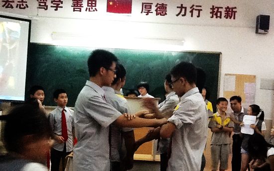 6月1日,我校迎来本学年第二次家会。七(15)班的孩子们以极高的热情和精湛的演技迎接亲人们的到来。家长会上,孩子们的真诚可爱、热情奔放、大胆投入、机智幽默,给人留下极为深刻的印象。家长们的精彩参与和声情并茂的演讲为我班家长会增色添彩。 七(15)班家长会的特色,可概括为以下几点: 1、节目丰富多彩,多侧面生动展示班级生活的方方面面。 家长师生同唱儿歌,梦回童年;击鼓传花亲子读信温馨相拥传真情;五分钟小组成语接龙,默契合作争先恐后显神通;读《弟子规·入则孝》篇,声声入耳字字入心;勇气与信任高台后仰倒下游戏,挑战自我,感受幸福与感动;“白雪公主”地道的英语口语、精彩的表演技巧演绎经典,令人拍案叫绝…… 2、家长积极参与,锦上添花。 七(15)班512女生宿舍五个孩子的家长和孩子们联袂儿歌联唱,歌声动听,舞姿优美;在“亲子诉真情”节目中,亲子相拥,非常感人;罗子琪妈妈鼓励孩子大声读出《写给家长的一封信》;集体生日会,家长主动要求班主任和孩子们一起合影,留住美好而温馨的瞬间;苏萃妍的妈妈带来生日蛋糕,并将准备的番薯苗栽种在班级菜地“欢酌园”;姚笛爸爸热情洋溢情文并茂的发言,道出了对孩子进步的喜悦之情,至真至诚,感人肺腑! 3、孩子们热情高涨,创意多多,彰显黄广学子的精神风采。 本次家长会的成功,源于孩子们对班级的高度认同感和广泛参与度。整个家长会的准备从总体规划、节目串词、演讲稿件、节目排练、主持人培训、课件制作、视频录制、学生个人主页设计等各个环节都由孩子们自己完成。毕子键、高嘉伟、玉敏怡、邓毓、高姗、黄华彤、刘茜、王子琦、姚笛、高姗、刘玉香、吴美琦、罗子琪、张子毅、等许许多多的孩子都功不可没。曾佑武客串主持、高嘉伟让老师在生日蛋糕上写祝福语的创意都是他们创新精神的体现。 4、团体活动项目多,学生参与广、效果佳。 本次家长会活动项目多,除凡人小语、儿歌联唱、太极扇表演、竖笛表演、校歌合唱、新概念英语背诵表演外,同学们还自创了成语接龙、“白雪公主”口语秀、挑战自我游戏、自行录制的《我骄傲我成功》视频、齐颂《三字经》等活动项目。几乎全班所有的学生都深度参与其中,达到班级练兵和自我教育的极佳效果。