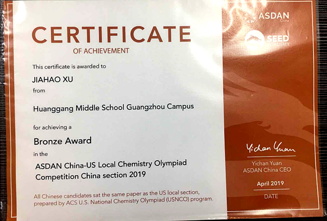 学校许嘉豪(JIAHAO XU)同学参加极具影响力的2019美国高中化学奥林匹克竞赛(USNCO),成功夺得大赛铜奖!