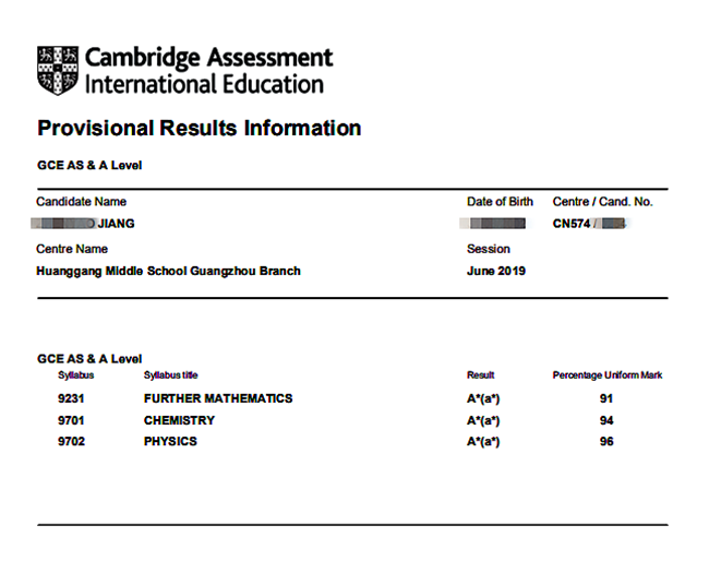 高二周同学获得2科A*1科A:96% A* Mathematics,90% A* Physics;