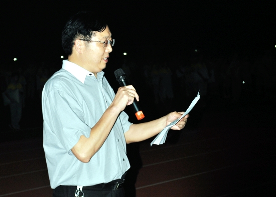接着,在田径场上举行了演练总结大会,会议由何东升局长主持。各年级迅速有序地整好队并清点人数,由江楚桥副校长代表学校向区政府领导报告了演练情况。随后全体参演人员及观摩的区政府领导一起为“5·12”汶川地震、“4·14”玉树地震、“4·20”芦山地震遇难同胞和在抢险救灾中牺牲的同志默哀一分钟。再接着,由副区长、区抗震救灾领导小组组长罗干政同志在演练总结大会上讲话,他对此次夜间地震应急疏散演练给予了高度评价,称赞学校组织有力、方案严密、演练规范、行动迅速,演练非常成功。他称赞此次活动,展示了黄广师生的优秀素质及精神风貌,师生的地震应急避险、自救互救能力得到提高。