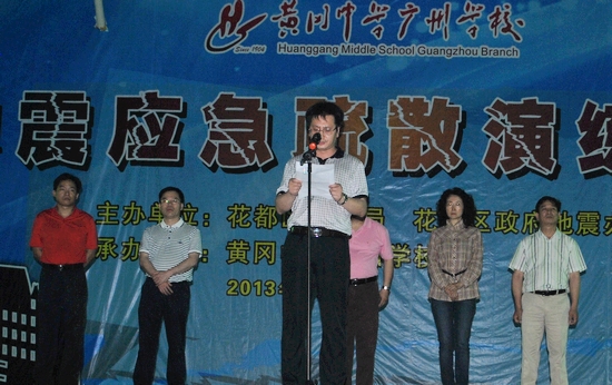 本次夜间演练活动由花都区教育局、区地震办主办,广州市黄广中学指导工作的领导有:花都区政府副区长、区防震抗震救灾工作领导小组组长罗干政同志,区人大常委会副主任、区科学技术协会主席徐兆东同志,区科技和信息化局局长、区防震抗震救灾工作领导小组副组长何东升同志,区教育局党委书记、局长王良平同志,区科技和信息化局副局长孙凤彩同志,区教育局党委副书记江杭章同志,区科学技术协会副主席邹顺均同志以及区教育局、科信局、科协、应急办和广州市黄广中学