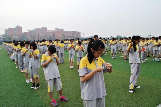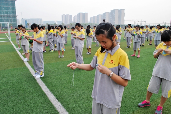 为丰富学生的课余生活,培养学生的实践操作能力和生活自理能力,在六一儿童节前夕,我校初一全体同学在运动场开展了一场别开生面的钉扣子培训活动。