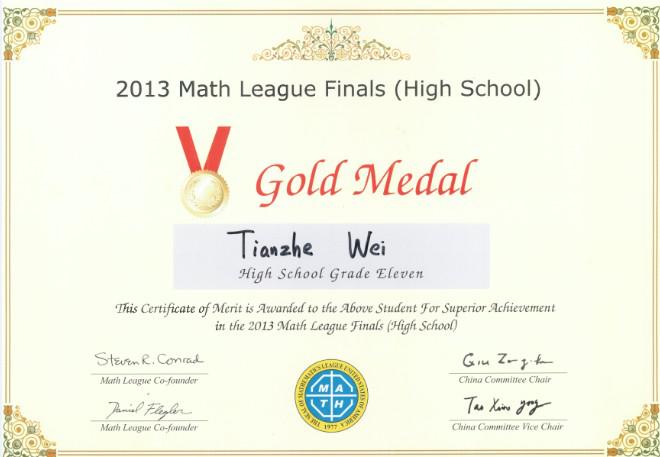 热烈祝贺我校国际部高三学生魏天哲荣获2013年美国“数学大联盟杯赛”高中组决赛金奖。