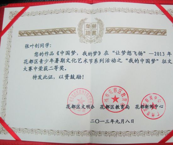 初三(2)班的张叶钊同学,一直对写作有浓厚的兴趣。8月,他先后参加了全国中小学生有奖征文比赛和花都区文明办、花都区教育局、花都区新闻中心联合举办的“让梦想飞扬”的征文比赛活动。直至最近,捷报频传——该生创作的《正能量是成功的加油站》一文被录入科学教育出版社书刊《全国中小学生优秀作文精选》;《中国梦,我的梦》一文获2013年花都区青少年暑期文化艺术节系列活动之“我的中国梦”征文大赛二等奖。