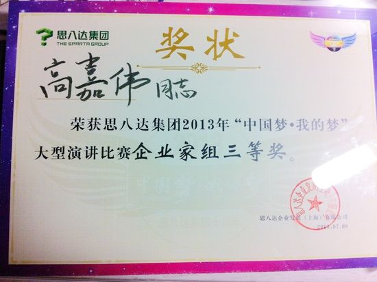 今年暑假,高嘉伟同学主动报名参加了思八达“中国梦·我的梦”广州赛区的演讲比赛并获得一等奖,晋级七月份的上海全国总决赛。在7月份的上海总决赛上,高嘉伟同学面对许多青年演讲家未露出丝毫胆怯之意,他以惯有的沉着镇定之风,精彩演绎,技惊四座,最终排名第六,荣获“企业家组”三等奖。
