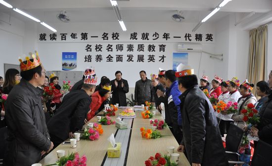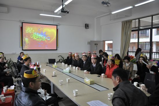 生日会伊始,陈明星副校长宣读了寿星名单,工会委员们送上了寿帽和象征幸福、吉祥的鲜花。工会主席江楚桥校长代表学校和董事会为在场的生日主角送上诚挚而趣味的祝福——每句贺辞都与马相关,响应马年新气象,颇有创意。伴随着熟悉而美妙的生日音乐响起,有桂华主任将生日大蛋糕捧到了桌面上。大家齐声唱起生日歌,共同向1、2月份的寿星们传达美好祝愿。