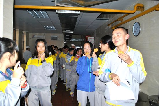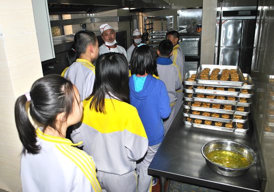 刘钢师傅首先带领我们来到了二楼厨房参观了消毒柜,详细地讲解了餐具消毒的方法、原理及过程;接着他带领大家观看了洗菜、切菜的工作台,工作台上干净整洁、井然有序,师傅们身着统一制服专注于手中的工作;紧接着,刘钢师傅打开了蒸煮米饭的蒸柜,一屉屉热气腾腾的米饭出现在眼前,同学们欢呼不已。到了面点间,一盘香喷喷的点心新鲜出炉,刘师傅热情地招呼大家尝个鲜,甜香四溢的糕饼让同学们回味无穷。冷库前,一股寒气扑面而来,“这里存放的是各类生鲜肉类食品,完全可以保证质量与鲜度,同学们可以放心食用”,刘师傅说。