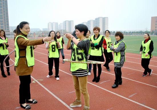 随后,谭老师对女职工进行趣味比赛随机分组,并宣布游戏规则,比赛活动拉开了序幕。在“快乐呼啦圈”中,女教职工们根据分组身穿不同颜色“战衣”,三个小组派出代表一边转呼啦圈,一边手穿别针,比赛讲求胆大心细,灵活敏捷的选手才有可能出奇制胜。“机智抢凳子”更是扣人心弦,每组选手在奔跑中抢夺有限的位置,体力、反应力都要接受考验。赛场上,欢笑声、鼓掌声、加油声此起彼伏,充分展示了我校女教职工活力四射的一面。