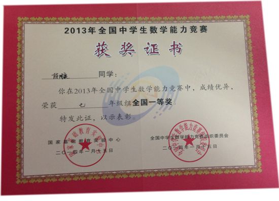 初中代表荣获全国中学生数学能力竞赛一、二、三等奖