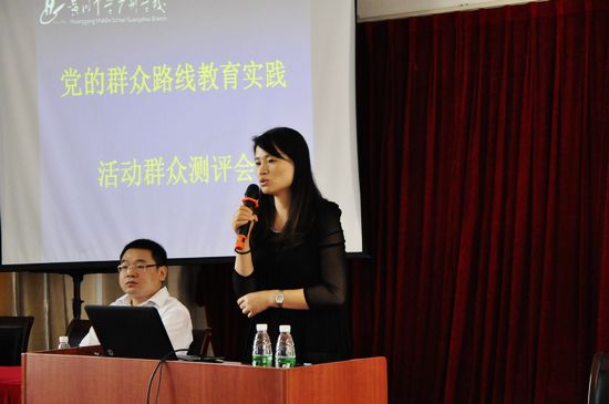 游烈峰书记代表学校就我校贯彻落实党的群众路线教育实践活动作出总结。游书记表示,广州市黄广中学作作风、以“实事求是”的工作原则,结合民办学校教育管理实际,通过全面推动扁平化管理、深化闭环管理等务实、有效方法,防范“官僚主义”“形式主义”,取得了良好效果,通过艰苦奋斗精神建设顶级精英学校、凝聚全校教职工的发展共识,防范“享乐主义”“奢靡之风”的滋生空间,从理论和实践两个高度,将群众路线化为我校实践精英教育理想、力求飞得更高、走得更远的致胜法宝,工作成效显著。