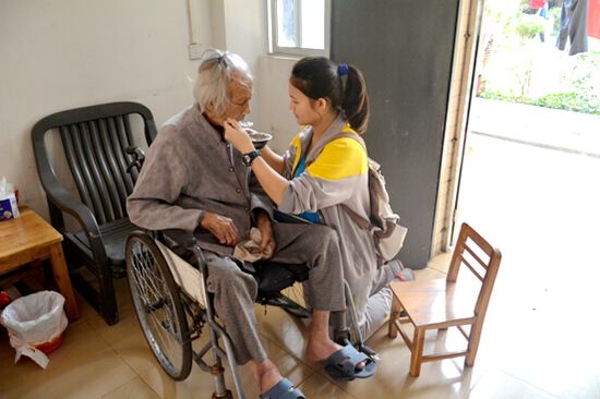 为了方便老人进食,稂可意同学双膝着地,耐心地将每一勺温度适中的米粥慢慢送至老奶奶嘴边。
