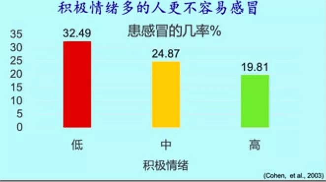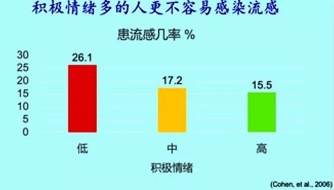 卡内基梅隆大学心理学教授谢尔顿•科恩(2003)曾做过一项研究,以专业而特殊的方式测量334名成年人的积极与消极情绪后,分别对参与实验的人群进行普通感冒与流行性感冒(由流行病毒引起的呼吸道感染),然后进行隔离观察,结果发现心态乐观平和的人更不容易患病。此外,科恩教授特别总结了正面情绪对人体健康发挥的影响: