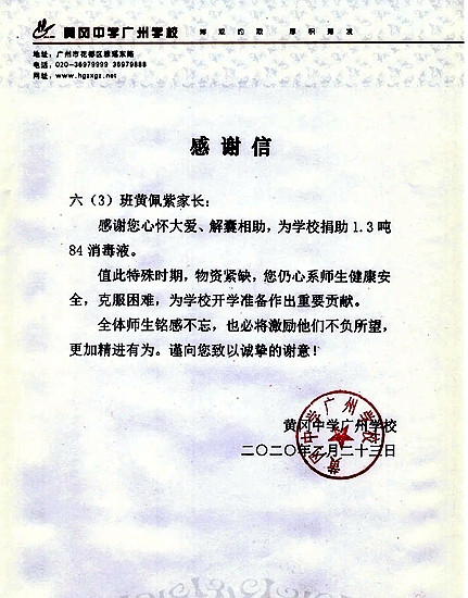 广州市黄广中学)班黄佩紫同学家长发出感谢信。