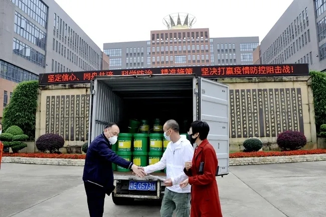 七(22)班陈舒洁同学家长特意向学校捐赠消毒液250千克(共10桶,每桶25千克)。