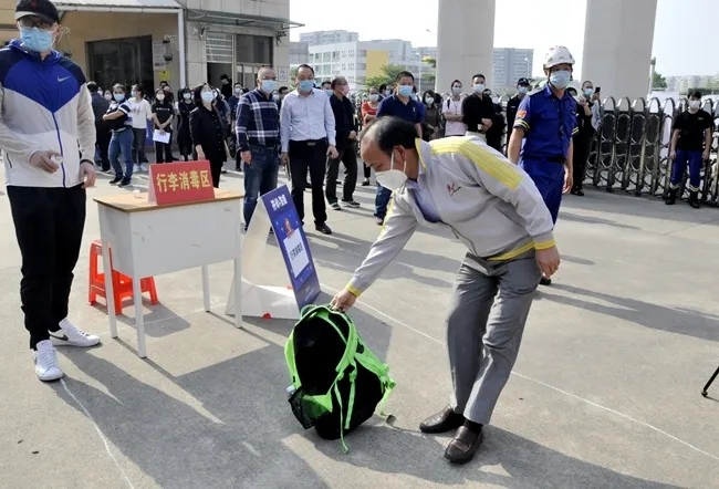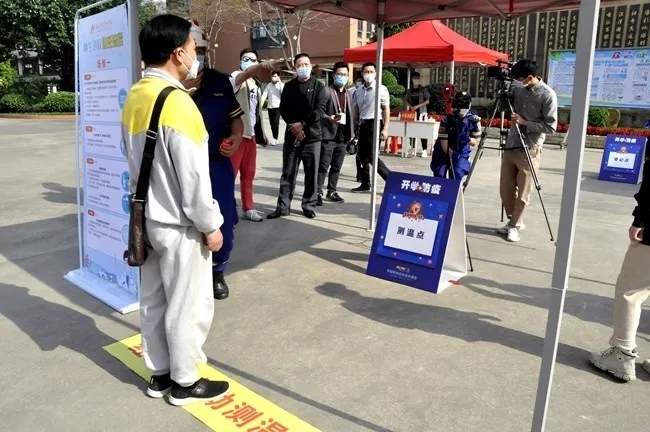 各年级“学生”(由老师进行角色扮演参与模拟)抵达学校,必须在校门口按照间距标线耐心等待,在保证维持“不扎堆,不拥挤”的1米安全距离中有序通过一道道“进校关卡”——检查口罩佩戴、额温枪测温、红外测温仪测温、学生手部消杀、行李消杀、进校登记。