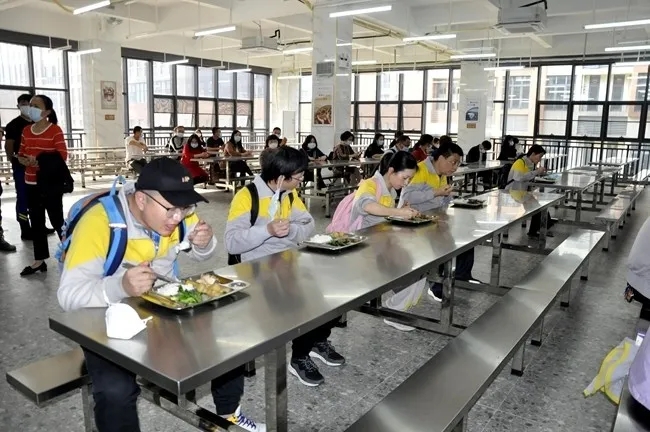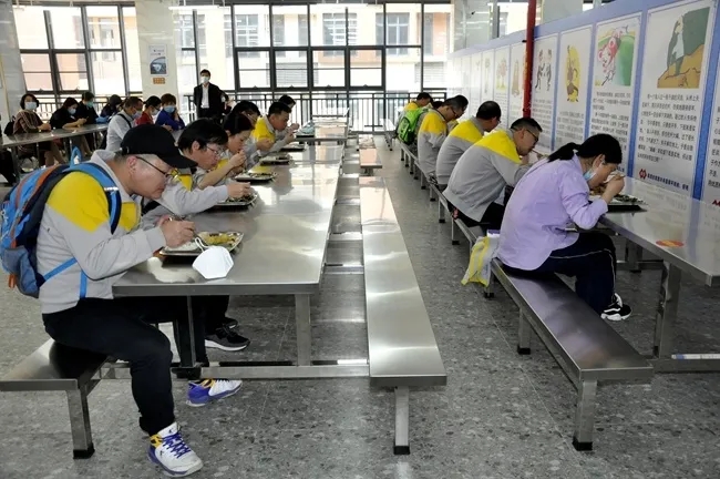 饭堂就餐流程演练,旨在显示学生在分时段、分班级就餐情况下,实际就餐时的人群管理、防疫监控等方法。