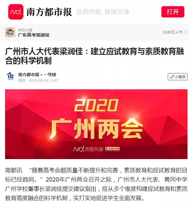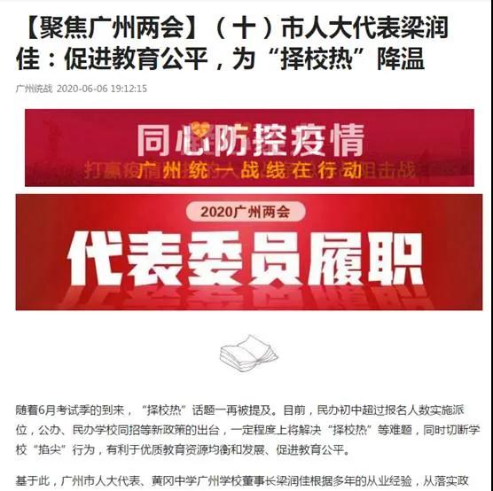广州两会期间,广州电视台、南方都市报、今日头条、新快报、信息时报等媒体纷纷报道广州市人大代表、黄广中学广州教育集团梁润佳董事长基于黄广办学经验的系列建议: