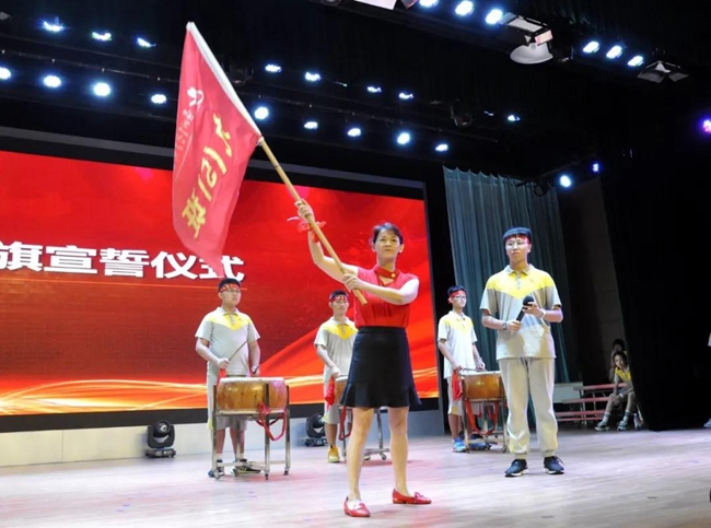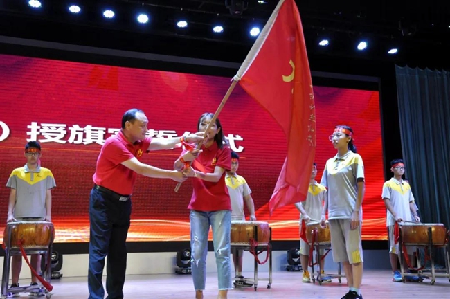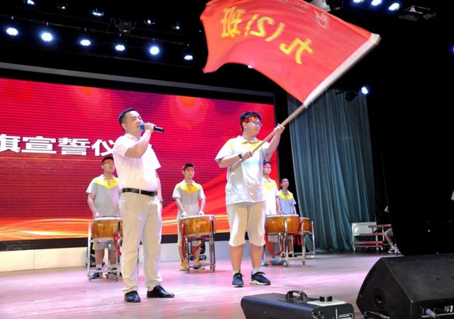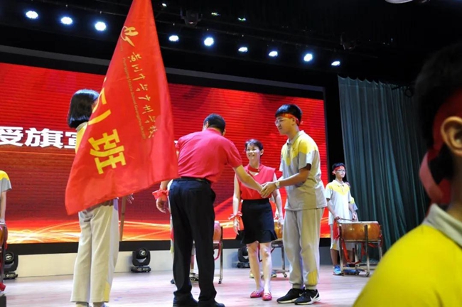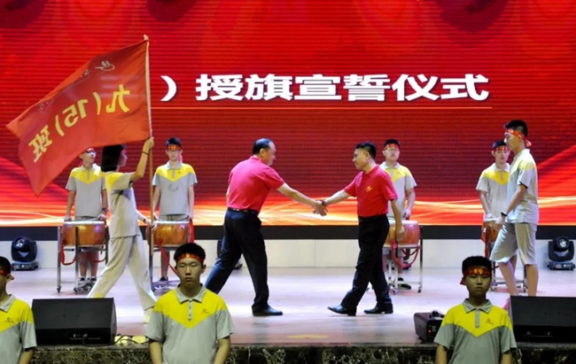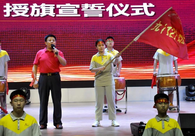 初三年级各班主任和班级领誓代表一同踏上舞台,在现场师生的见证下,接过由杨文化副校长授予、象征着“燃烧斗志”的班级旗帜。
