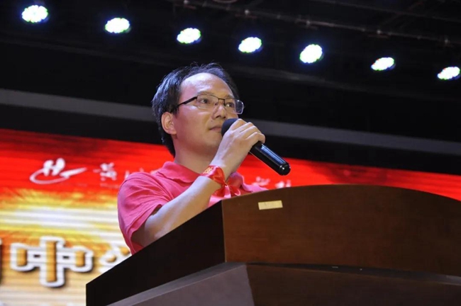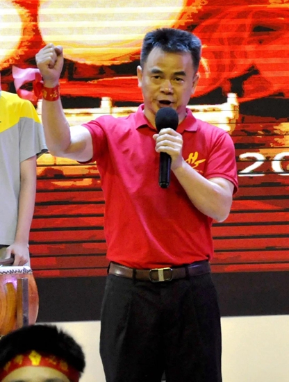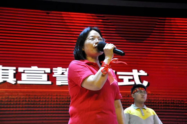 范小星校长代表董事会,向初三年级授予军团战旗。这已是黄广学校中考誓师的一项传统,今年由刘清华、殷玉莲两位主任共同承接使命。
