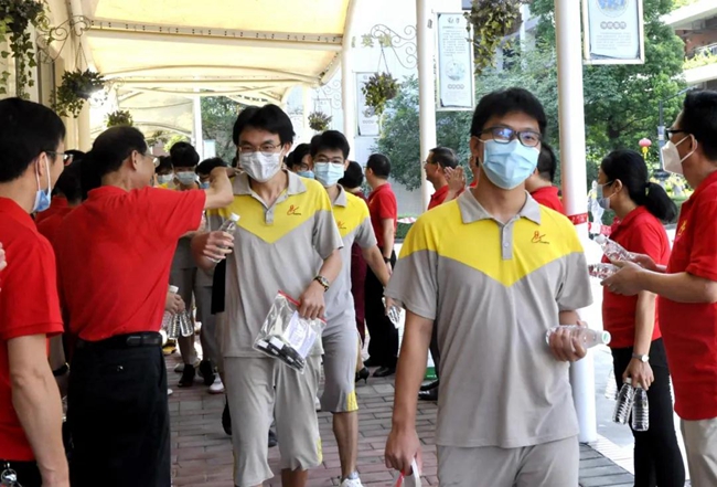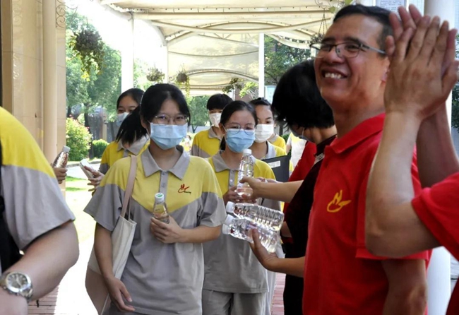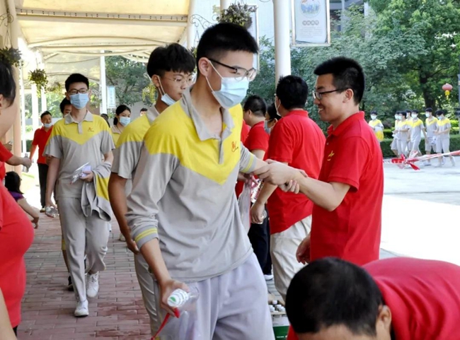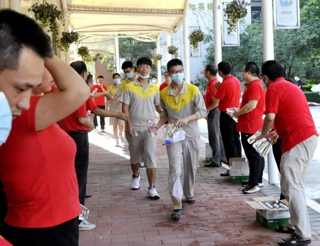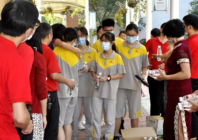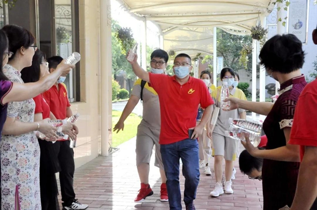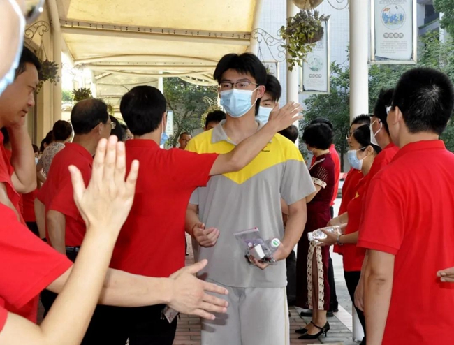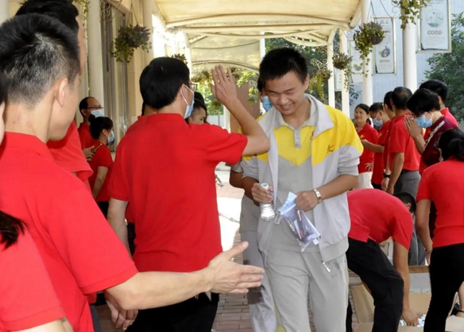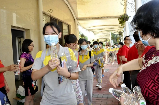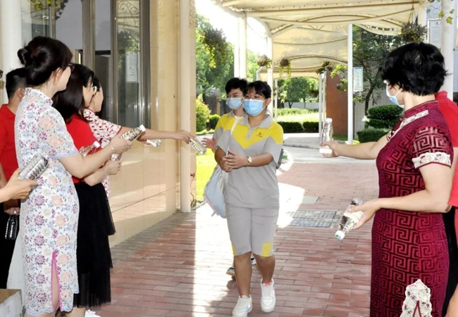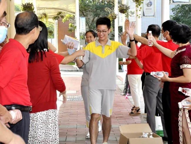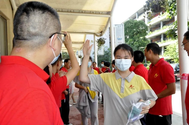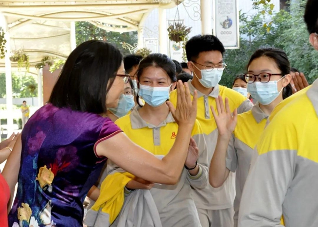 身着鲜红战服或旗袍加身的高三老师专门共组“送考战队”,等候在考场的必经之道,与学校领导特别延续“送水击掌”的振奋士气传统,向迈步考场的黄广勇士们送上祝福与鼓励,正式进入“战斗状态”的高三勇士们,在声声祝福、阵阵欢呼中朝着理想战场踏出坚毅的步伐。
