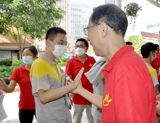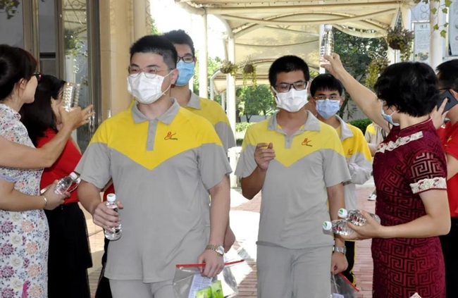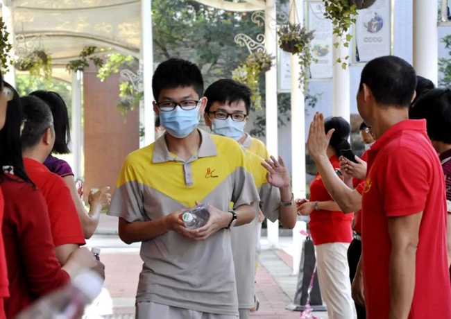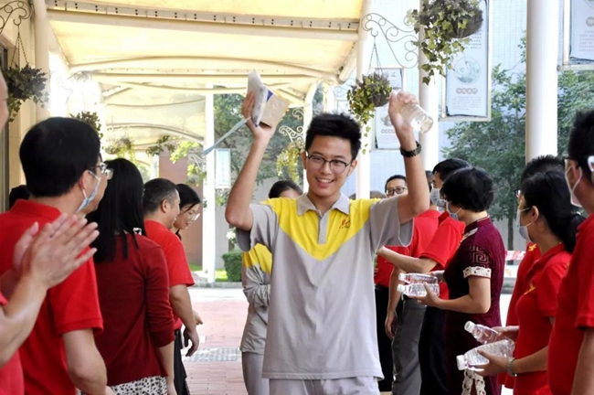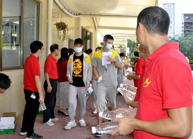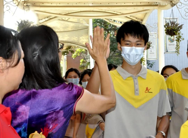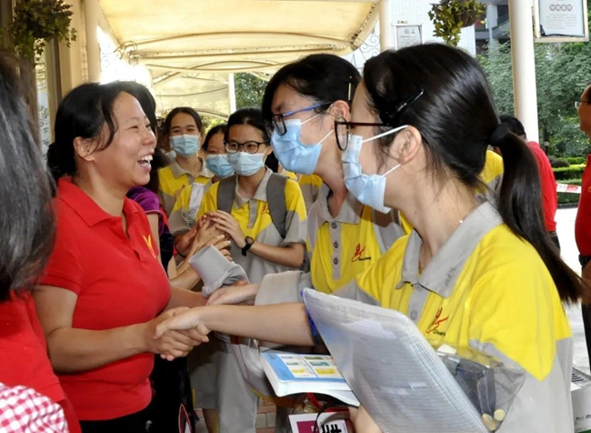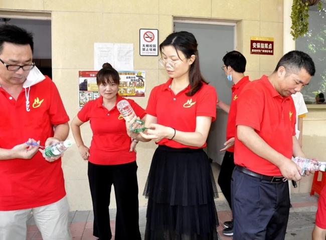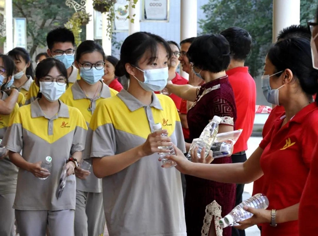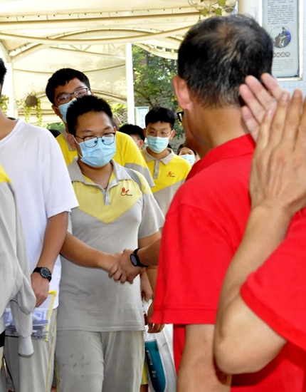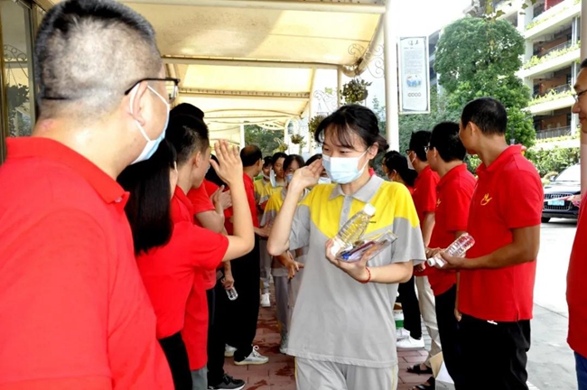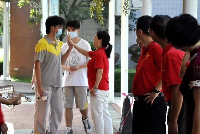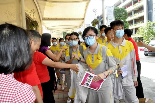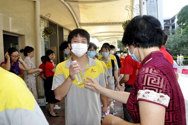 身着鲜红战服或旗袍加身的高三老师专门共组“送考战队”,等候在考场的必经之道,与学校领导特别延续“送水击掌”的振奋士气传统,向迈步考场的黄广勇士们送上祝福与鼓励,正式进入“战斗状态”的高三勇士们,在声声祝福、阵阵欢呼中朝着理想战场踏出坚毅的步伐。