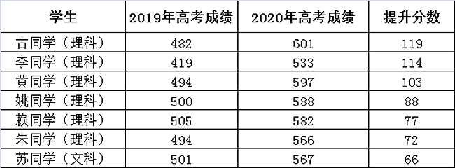 以下是2019届复读学生经黄广学校一年学习指导,参加2020年高考成功创造的提升飞跃(部分案例)。