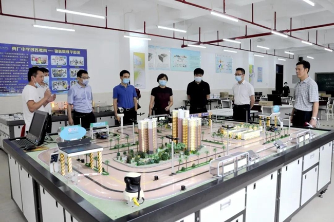梁润佳董事长、游烈峰校董、范小星执行校长等对调研考察团的到来表示热烈欢迎,并陪同来宾先后走进陶艺实践基地、学生素质教育成果陈列馆、创客教育基地、禁毒教育馆、模拟法庭基地、心理教育专用室等,在学校领导陪同讲解下,对黄广学校以“智慧教育,英达天下”为办学目标打造的精英培养体系进行了解。