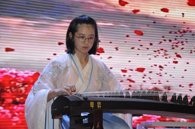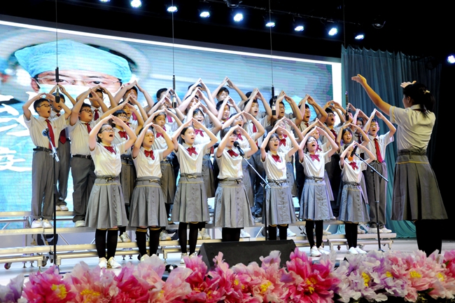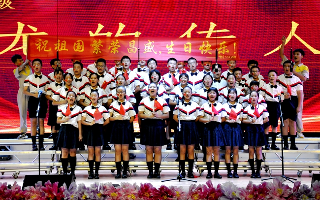舞台上,师生歌唱家们以歌抒怀,热血沸腾的高唱与张扬飞舞的旗帜交织出的震撼人心的画面,为爱国主义精神了注入了黄广人热爱祖国、憧憬未来的能量;