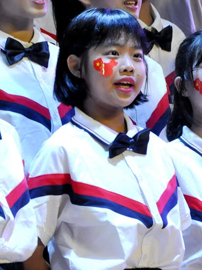 五星红旗迎风飘扬,胜利歌声多么响亮,歌唱我们亲爱的祖国,从今走向繁荣富强……”