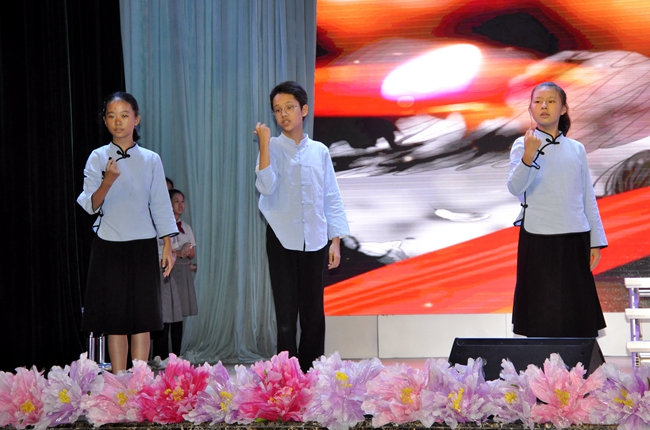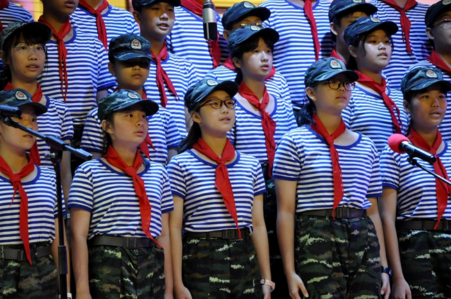 礼堂内,班级学生以歌声对决,力量奔腾的放歌与青春激扬的呐喊碰撞出耀眼璀璨的星火,为爱国主义情怀抹上了现代学子无所畏惧、拼搏奋勇的色彩;