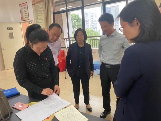 共青团花都区委陈得部长、教育团工委许卫珍书记及范小星校长、杨文化副校长等陪同来宾仔细查阅了黄广学校团建档案资料,来宾们对学校团委工作规范化建设给予好评,并提出具体指导意见。