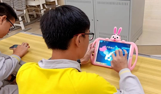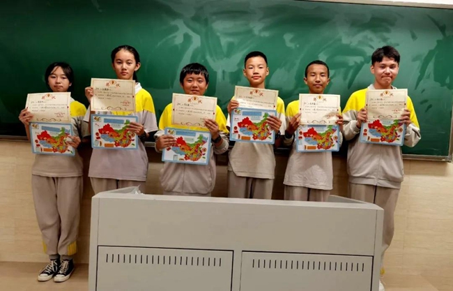 终极赛场上,经过年级内部层层选拔、跻身决赛的学生充分发挥聪明才智,动用灵巧的小手指,在“人手一本”的校本学习工具黄广PAD学习机上即场拼制出了一幅幅绚丽缤纷的中国地图,在作品中注入天马行空的艺术妙想,向学校师生大胆展示心目中的“多彩祖国”。