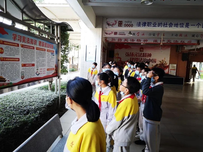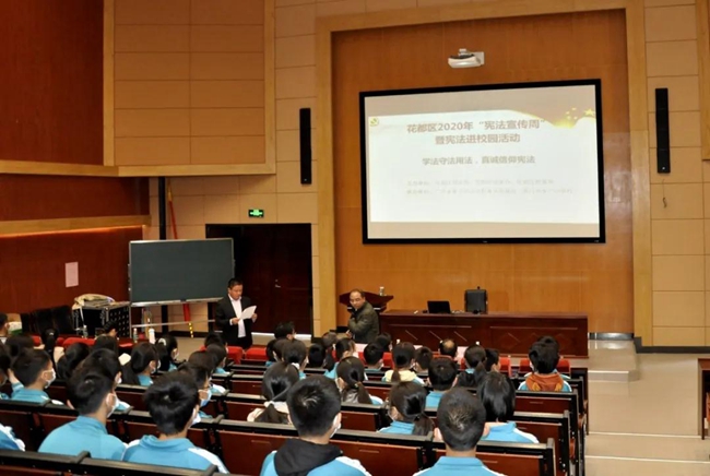 花都区2020年“宪法宣传日”系列活动以“学法守法用法,真诚信仰宪法”为主题,分为三大部分——黄广“法治知识宣传长廊”参观学习+校园法治教育专家专题讲座+师生宣誓。