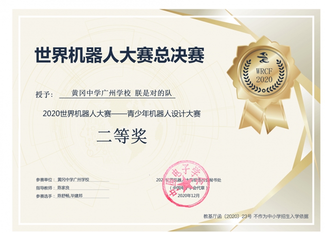 近日传来喜讯:黄广中学广州教育集团(简称黄广集团)下属广州市黄广中学、广州市黄广中学广小学)的派出精英学子共组K15创客队,参加2020年世界机器人大赛(WRCF2020)总决赛,成功获得大赛二等奖。